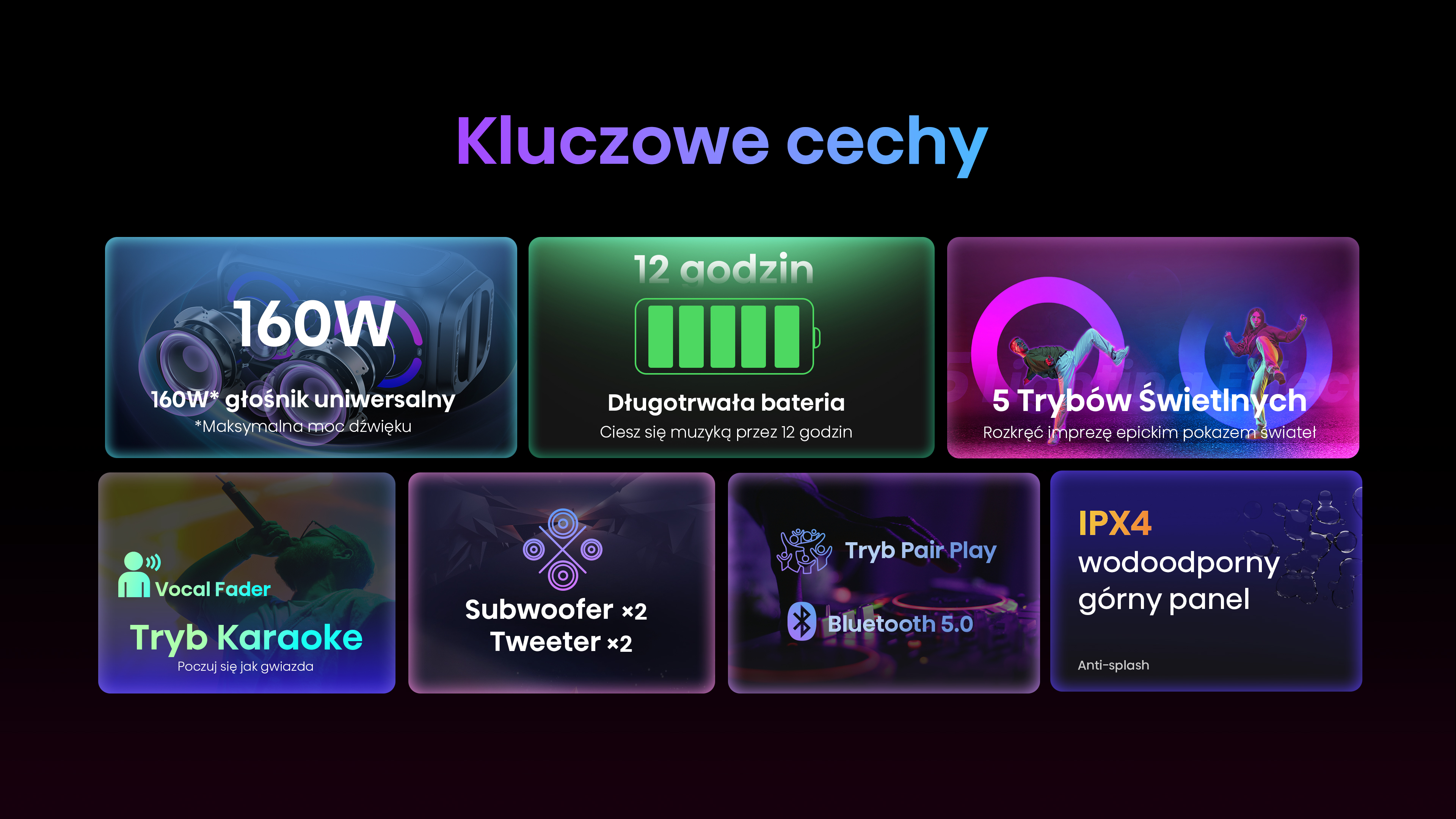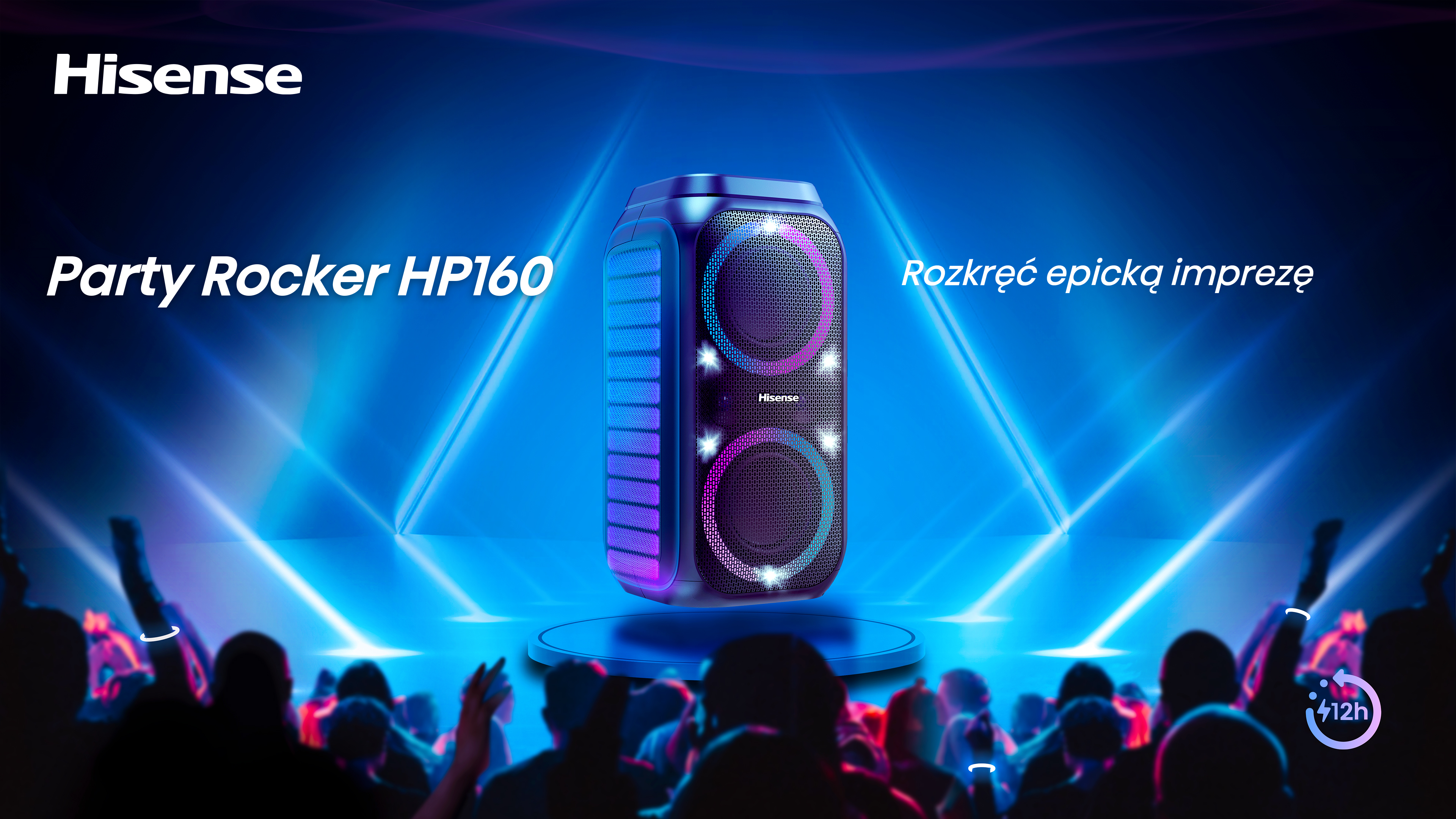 Rozkręć każdą domówkę i plener z mocą 160 W - Party Rocker 160 gwarantuje głęboki bas, czyste wysokie tony i efekty świetlne LED zsynchronizowane z muzyką.