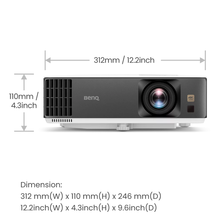 Z wymiarami 31 cm szerokości , 11 cm wysokości i 25 cm długości oraz wagą 3.1 kg, BenQ TK700 jest kompaktowy i łatwy w montażu. Jeśli poszukujesz systemu mocowania, ekranu projekcyjnego do BenQ TK700 - skontaktuj się z nami, dobierzemy odpowiednie akcesoria.