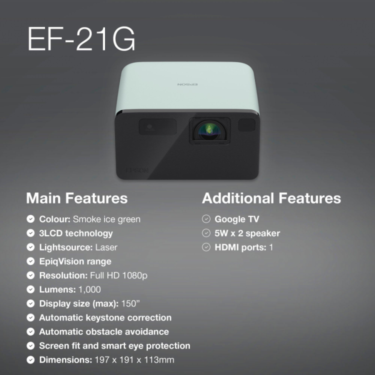 Projektor Epson EF-21R wyświetla jasny obraz w formacie 16:9 z jasnością na poziomie 1000 ANSI lumenów , co sprawia, że każdy szczegół powinien być widoczny (nawet w pomieszczeniu, w którym nie jest całkowicie ciemno), a wysoki kontrast 2500000:1 podkreśla głębię kolorów.