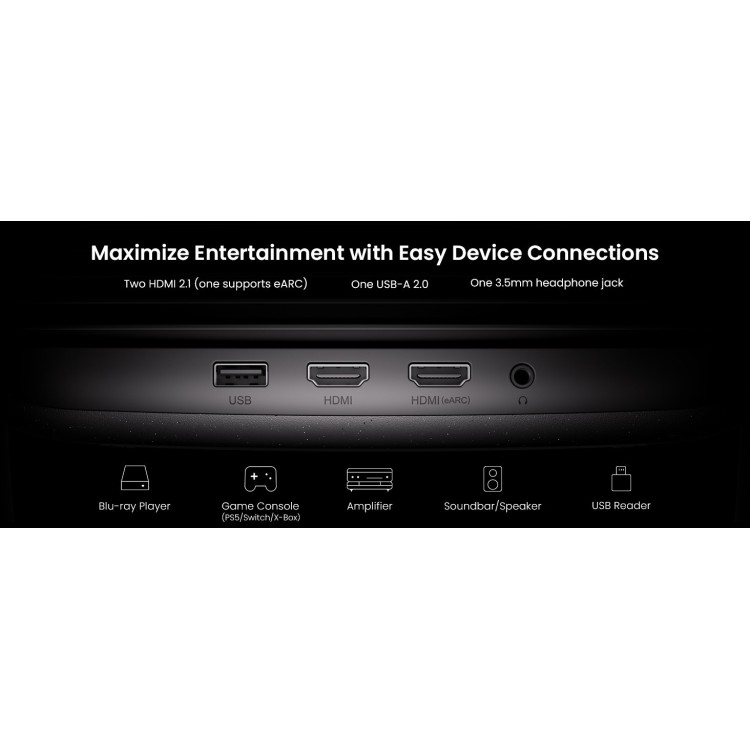 Dzięki dostępnym złączom 1x 3.5mm minijack, 1x USB 2.0, 2x HDMI2.1 łatwo podłączysz ten projektor JMGO N1S Ultimate - 2% rabatu z kodem JMGOPRO do amplitunera, soundbara, komputera, konsoli, odtwarzacza BLU-ray lub innego systemu.