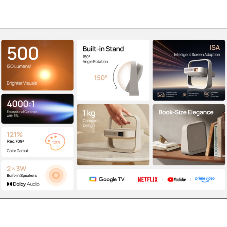 Doskonałe wrażenia z użytkowania tego projektora zapewniają takie funkcje jak App Store, Apps, Auto Focus, Automatyczna korekta trapezu, Bluetooth, Chromecast, Czujnik ochrony oczu, Google Home, Google TV, Keystone HV, OK Google, WiFi, Źródło światła o długiej żywotności .